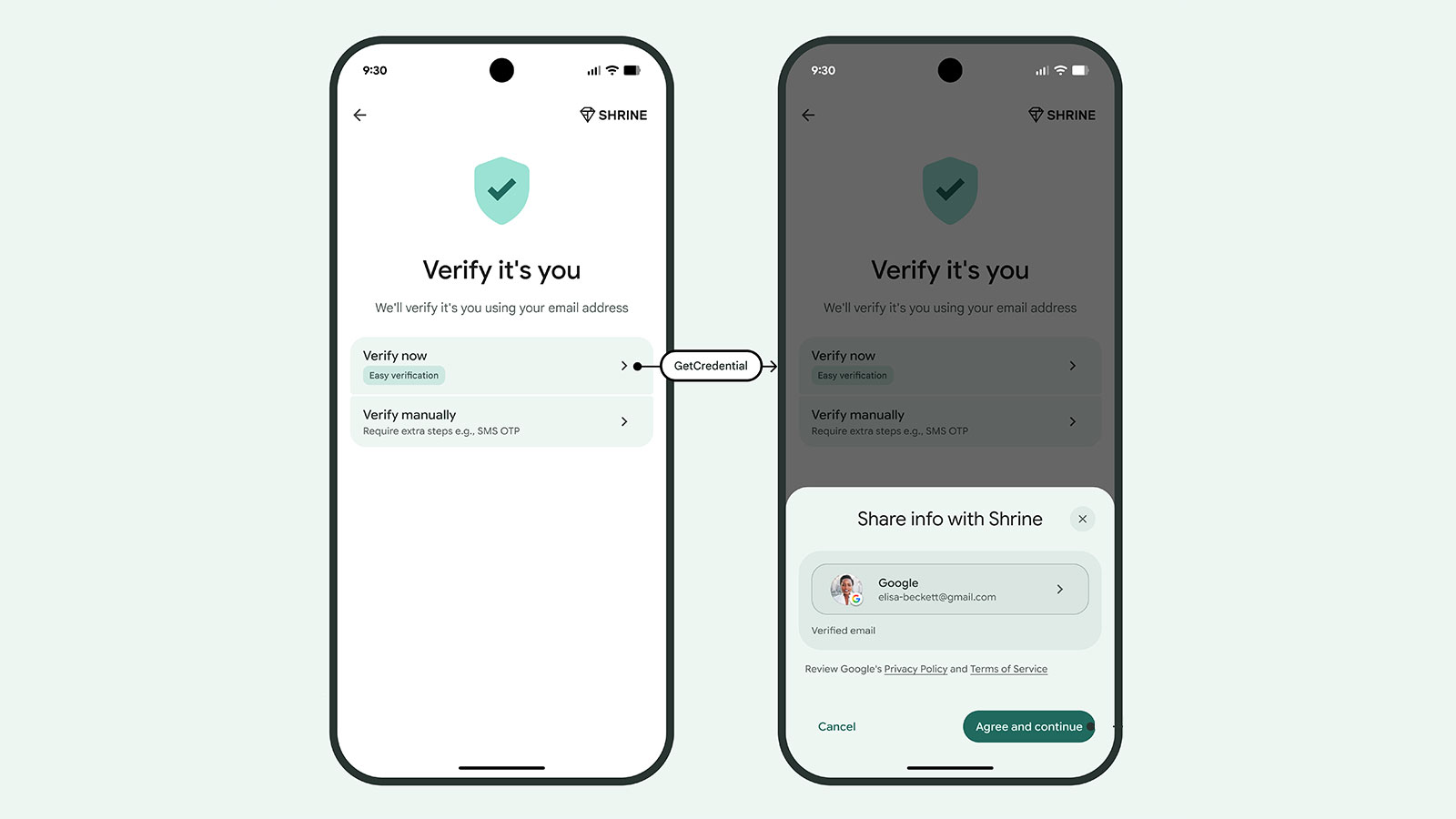 Αντί για κωδικό, η Google εκδίδει απευθείας στη συσκευή Android ένα verified email credential, το οποίο συνδέεται με τον λογαριασμό Google του χρήστη. Όταν ο χρήστης αγγίξει ένα πεδίο email ή πατήσει «Εγγραφή» ή «Ανάκτηση λογαριασμού», εμφανίζεται στο κάτω μέρος της οθόνης ένα native παράθυρο του Android που δείχνει ακριβώς ποιες πληροφορίες ζητά η εφαρμογή. Ο χρήστης πατά «Agree and continue» και η εφαρμογή παραλαμβάνει αμέσως το επιβεβαιωμένο email.