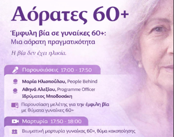 Στην εκδήλωση η συνιδρύτρια της People Behind, Μαρία Ηλιοπούλου, θα παρουσιάσει τα αποτελέσματα του έργου «Αόρατες 60+» και τα ευρήματα της μελέτης για την έμφυλη βία με θύματα γυναίκες 60+ στην Ελλάδα, που πραγματοποιήθηκε από την People Behind το 2025.