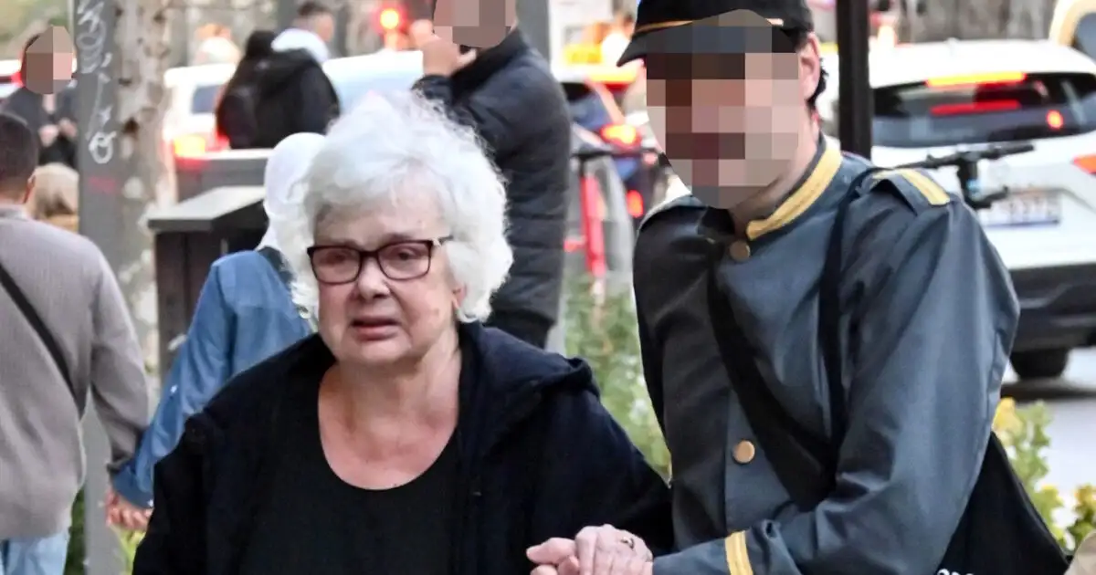 Η Ξένια Καλογεροπούλου ήταν ντυμένη στα μαύρα και περπατούσε με τη βοήθεια του μπαστουνιού της, ενώ ένας άντρας τη συνόδευε στη βόλτα της στο κέντρο.