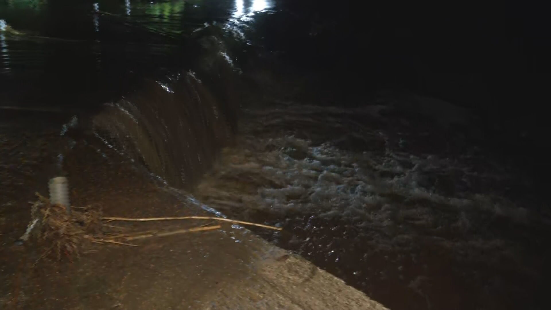Στο σημείο υπάρχει ιρλανδική διάβαση, η οποία έχει καλυφθεί από τα ορμητικά νερά που κατεβαίνουν από μεγάλο ύψος, δημιουργώντας συνθήκες «καταρράκτη» μέσα στο ρέμα. Ο μεγάλος όγκος νερού έχει μεταφέρει φερτά υλικά, όπως κλαδιά και καλαμιές, τα οποία έχουν συσσωρευτεί στα δέντρα, δυσχεραίνοντας περαιτέρω τη ροή και επιδεινώνοντας την κατάσταση.