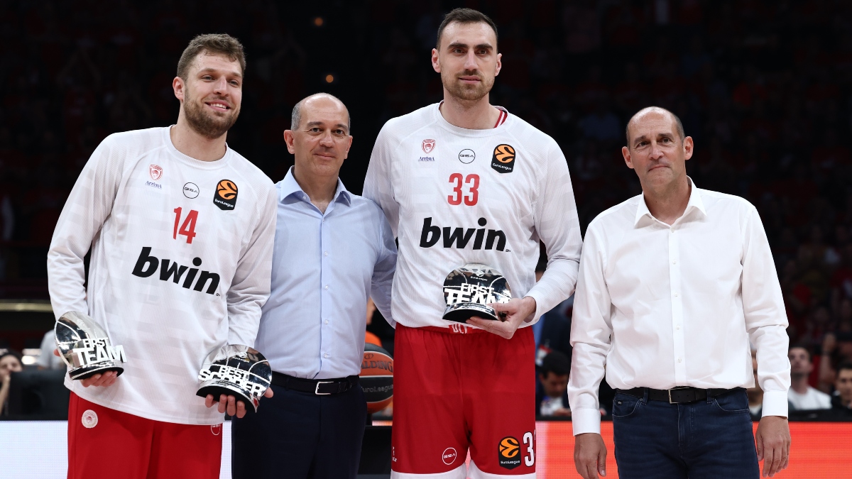 Λίγο πριν το τζάμπολ του πρώτου αγώνα του Ολυμπιακού με τη Μονακό για τα playoffs της EuroLeague, οι Γιώργος και Παναγιώτης Αγγελόπουλος τίμησαν τους Σάσα Βεζένκοφ και Νίκολα Μιλουτίνοφ.